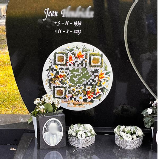 Gepersonaliseerde fotoplaat met kleine artistieke QR-code + digitale herdenkingspagina