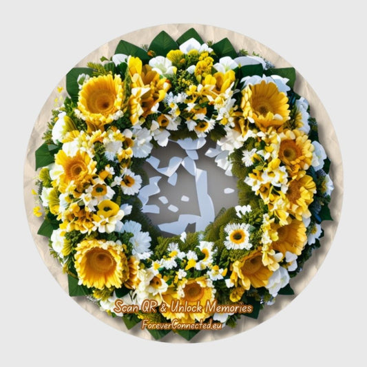 QR Bloemenkrans met zonnebloemen, veel kleine witte bloemen en groen + digitale gedenkpagina